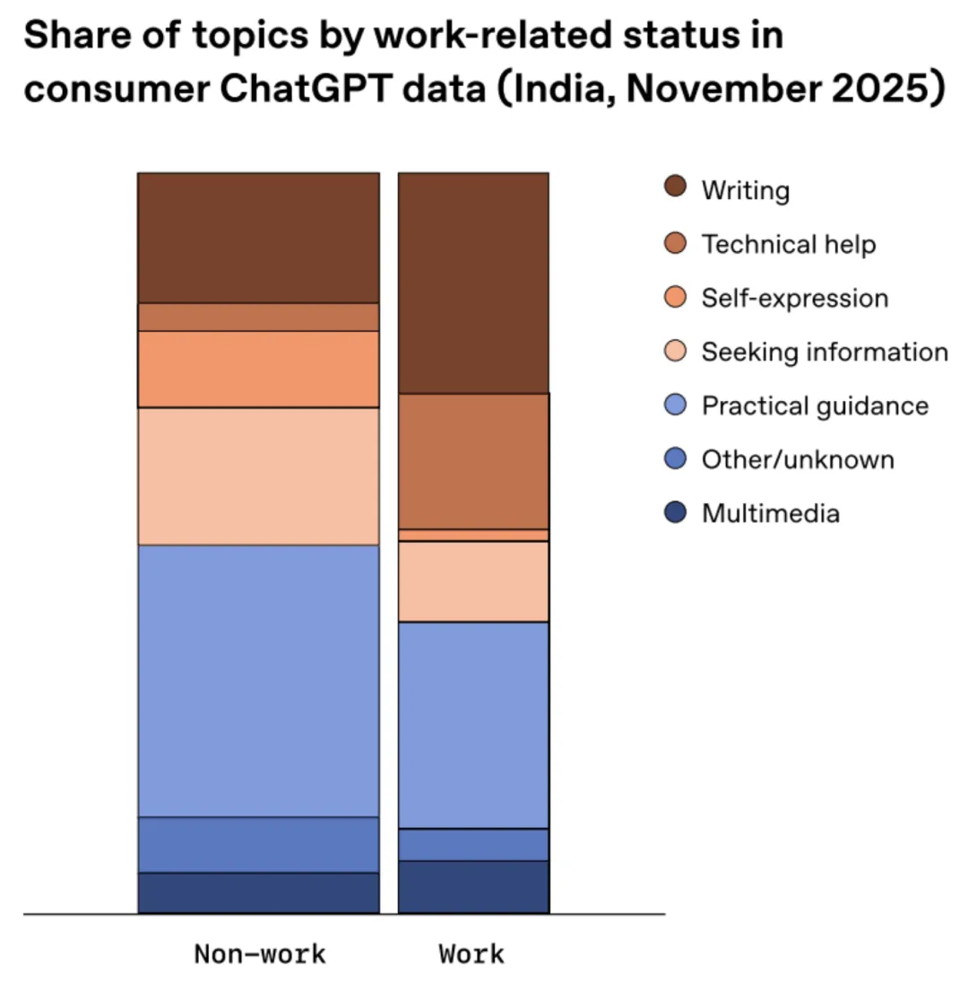 尽管如此,印度在消费级ChatGPT上发送的工作相关消息比例(约35%)仍高于全球平均水平(约30%)。