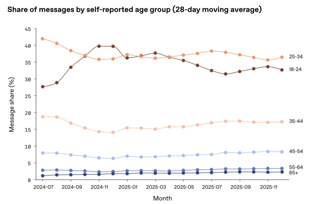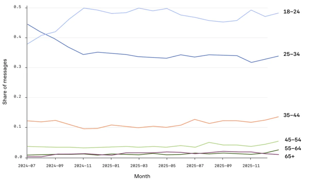 2024年中期,18-24岁的用户超过了25-34岁的用户,成为ChatGPT上发送消息份额最大的群体。目前,这个年龄段发送的消息占印度ChatGPT所有消息的近一半——显著超过全球约三分之一的水平,但与25岁以下人口占印度人口40%的比例大体一致。