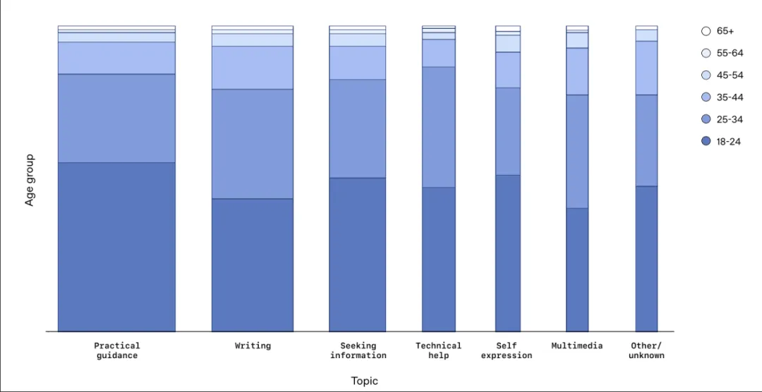 普丽雅,29岁,班加罗尔的软件工程师,工作中遇到一个棘手的调试问题,习惯性地让ChatGPT帮忙分析代码(技术帮助)。作为25-34岁的职场中坚,她在与技术帮助相关的消息份额上,略高于她在总体使用中的份额。