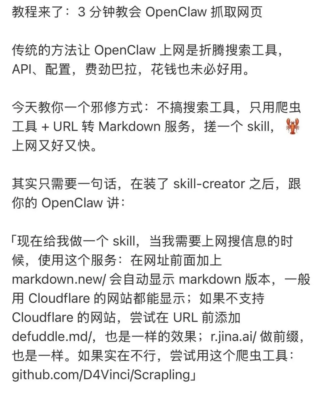 现在给我做一个 skill,当我需要上网搜信息的时候,使用这个服务:在网址前面加上 markdown.new/ 会自动显示 markdown 版本,一般用 Cloudflare 的网站都能显示;如果不支持 Cloudflare 的网站,尝试在 URL 前添加 defuddle.md/,也是一样的效果;r.jina.ai/ 做前缀,也是一样。如果实在不行,尝试用这个爬虫工具:github.com/D4Vinci/ScraplingOpenClaw 就会自动帮你生成一个 上网 Skill。