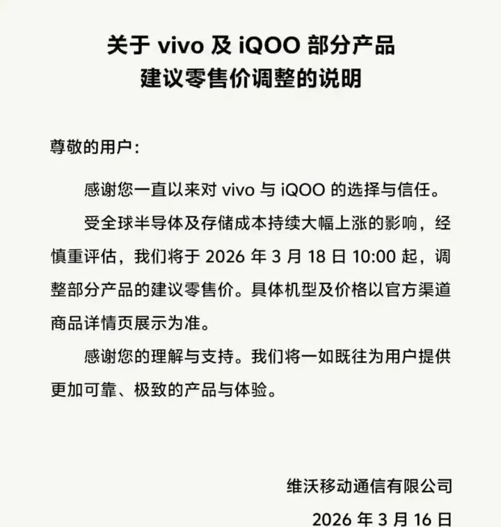 vivo 发布《关于 vivo 及 iQOO 部分产品建议零售价调整的说明》,宣布将于 3 月 18 日(本周三)10:00 起调整部分产品的建议零售价,具体机型及价格以官方渠道商品详情页为准。