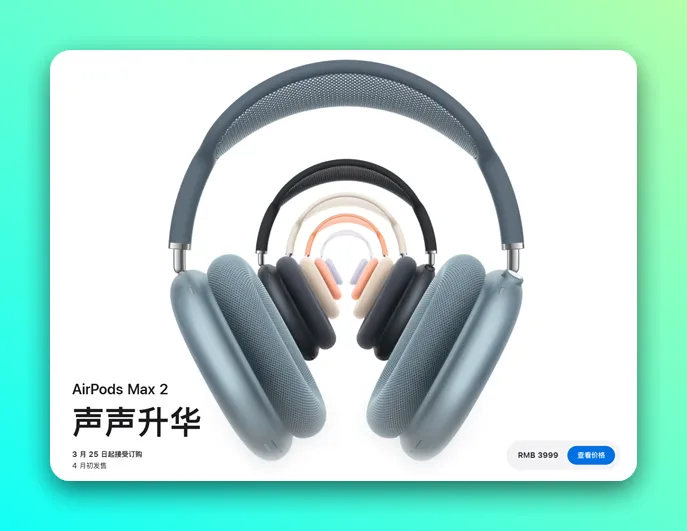 苹果正式发布 AirPods Max 2 头戴耳机,售价 3999 元,将于 3 月 25 日接受预购,4 月初正式发售。据介绍,AirPods Max 升级为 H2 芯片,首次支持自适应音频、对话感知和语音突显等功能。