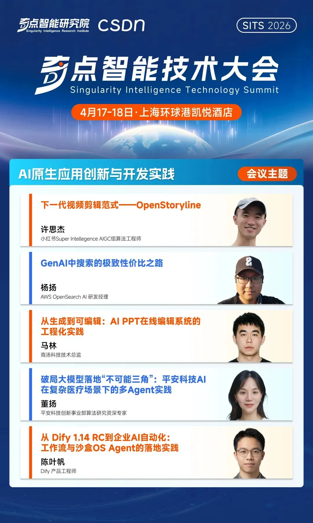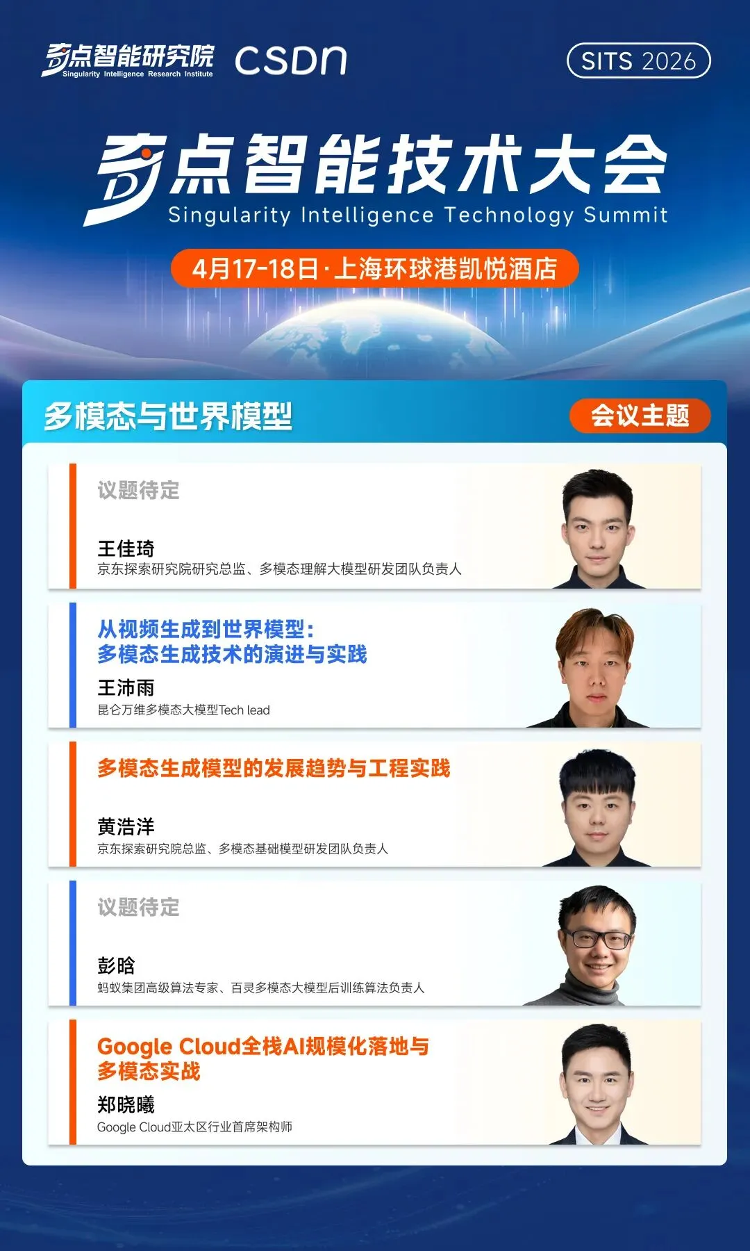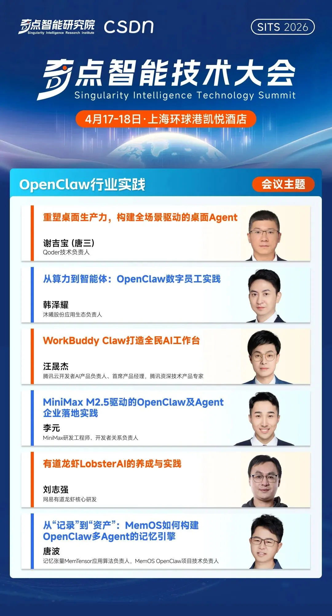 从 OpenClaw 激发的全民智能化热潮,到企业级 AI 编码工具在万人研发组织中的体系化落地。无论是巨头们以“AI 提效”为名进行的大规模裁员,还是英伟达黄仁勋在 GTC 上宣告 SaaS 的死亡,AI Agent 将全面接管——所有这些热点事件,都像一块块棱镜,折射出同一个未来:我们正在步入一个由 Agent 驱动、自动化程度极高的新周期,但与之匹配的工程规范、安全体系、组织形态乃至社会契约,都尚未准备好。在这样的背景之下,开发者、行业专家与企业领袖该如何系统性地理解这场变革,又该如何找到自己的坐标与路径?这正是 「2026 奇点智能技术大会」 希望回答的问题。由 CSDN 与奇点智能研究院联合举办的 2026 奇点智能技术大会(原全球机器学习技术大会)将于 4 月 17-18 日在上海·环球港凯悦酒店正式召开。本次大会将深入探讨从多模态到世界模型、AI 原生研发到 AI Infra 基础设施与运维、大模型系统架构、Agent 系统与工程等 12 大前沿专题,旨在为穿越这场“十倍速变革”绘制一份兼具前瞻性与实战性的认知地图。在距离大会召开 30 天之际,我们把一些重磅专题的硬核看点掰开,带你直击 AI 落地核心。2026 年,大模型赛道早已过了“盲目拼参数”的蛮荒时代。当模型要真正在大规模业务中跑起来,技术决策者们面临的是极其现实的拷问。在「大语言模型技术演进」专题中,我们邀请到了奇点智能研究院院长、CSDN 高级副总裁李建忠、新浪微博首席科学家及 AI 研发部负责人张俊林、微软亚洲研究院高级研究员刘啸、上海人工智能实验室研究员及大模型中心负责人陈恺、微软亚洲研究院香港首席研究员刘树杰等顶尖学者与技术专家,为参会者构建一套完整的大模型技术演进新坐标。迈向“数字生命”:Agent 的设计模式与落地深水区在「智能体系统与工程」专题中,我们邀请了 4 位走在最前沿的系统架构师与算法领袖,带你告别“盲盒式”开发,真正掌握构建可靠 Agent 的工程底牌。腾讯微信搜索 AI 算法研究方向负责人、专家研究员王炳宁,将带来微信在超高并发下,构建可靠 AI 搜索 Agent 的实战复盘。美团 Staff Researcher 薛涛锋 与 Macaron AI 首席科学家马骁腾将分别从操作电脑的 Computer Use Agent 和 Context Learning 切入,深度拆解如何通过低成本强化学习、十万级沙盒基建等硬核手段,让 Agent 摆脱对人工编排上下文的依赖,真正在真实交互中实现“自我进化”。新加坡科技研究局(A*STAR)高性能计算研究所 AI 研究员 ,《Agent 设计模式》作者黄佳,将带来《Agent 设计模式:从认知架构到工程落地》。他将跳出具体的代码实现,为你交付一套覆盖感知、推理、协作等六大维度的顶层架构设计图纸。在「OpenClaw 行业实践」专题下,我们邀请了 6 位在这场“百虾大战”中冲在最前线的实战派。无论你是想为企业引入数字员工的 IT 负责人,还是试图基于 OpenClaw 框架做二次开发的技术极客,你都将在这里获得从算力适配、记忆构建到产品级改造的完整避坑指南。腾讯云开发者 AI 产品负责人汪晟杰将带来《WorkBuddy Claw 打造全民 AI 工作台》;网易有道龙虾核心研发刘志强将全景复盘《有道龙虾 LobsterAI 的养成与实践》;同时,Qoder 技术负责人谢吉宝(唐三) 将深入剖析如何《重塑桌面生产力,构建全场景驱动的桌面 Agent》。记忆张量 MemTensor 应用算法负责人、MemOS OpenClaw 项目技术负责人唐波,将在《从“记录”到“资产”:MemOS 如何构建 OpenClaw 多 Agent 的记忆引擎》中,揭秘如何让智能体学会持久化记忆管理,实现经验与上下文的高效复用。沐曦股份应用生态负责人韩泽耀将从底层 GPU 算力出发,分享《从算力到智能体:OpenClaw 数字员工实践》;而 MiniMax 研发工程师李元将带来《MiniMax M2.5 驱动的 OpenClaw 及 Agent 企业落地实践》,展示国产大模型如何与开源框架深度绑定,释放最强生产力。当 Infra 遇上 Agent,多 GPU 集群的自动化运维破局这是一场专属于 Infra 工程师、算力集群负责人和底层系统架构师的硬核专场。如何用 Agent 思想重塑运维体系,为你提供一份能直接拿回公司省下真金白银的系统级实战指南。在「AI Infra 基础设施与运维」专题中,我们邀请到无问芯穹技术副总裁吴保东将直击万卡集群痛点,带来《基于 Agentic Infra 的 AIOps 智能体系统:面向多 GPU 集群的自动化运维破局与实践》;同时,清程极智副总裁何万青将抛出极具前瞻性的《Agentic AI Infra: 以智能体为中心的八卦炉智能软件栈》。他们将展示如何让基础设施具备“自我感知与修复”的生命力。北京智源人工智能研究院 AI 框架研发负责人敖玉龙将硬核解析《基于 FlagOS 技术栈的大模型框架多芯片统一高效插件体系》,带你跨越异构算力的适配鸿沟;而来自昆仑芯的推理框架架构师马阳,则将从国产高端 AI 芯片的视角,探讨底层推理框架的极致优化与性能压榨。清微智能技术专家楼群芳将分享《可重构计算超节点的理论探索和实践》,揭秘如何通过芯片架构的动态重构,适应瞬息万变的 AI 算法需求;启元实验室数据智能团队负责人马少楠则将带来《面向大模型时代的软硬协同计算架构与数智融合实践》,从国家级实验室的宏大视角,给出算力与数据智能融合的顶层解法。从前端的动态渲染机制、业务工作流的编排,到后端的搜索降本优化,现场听众将带走一份能真正将 AI 从“酷炫玩具”变成“商业摇钱树”的落地实战图谱。在