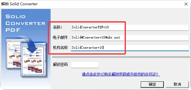 11.在名称栏输入【SolidConverterPDFv10】,在电子邮件栏输入【Solid@Converterv10@ukr.net】,在机构名称栏输入【SolidConverterv10】。(不要关闭此界面)