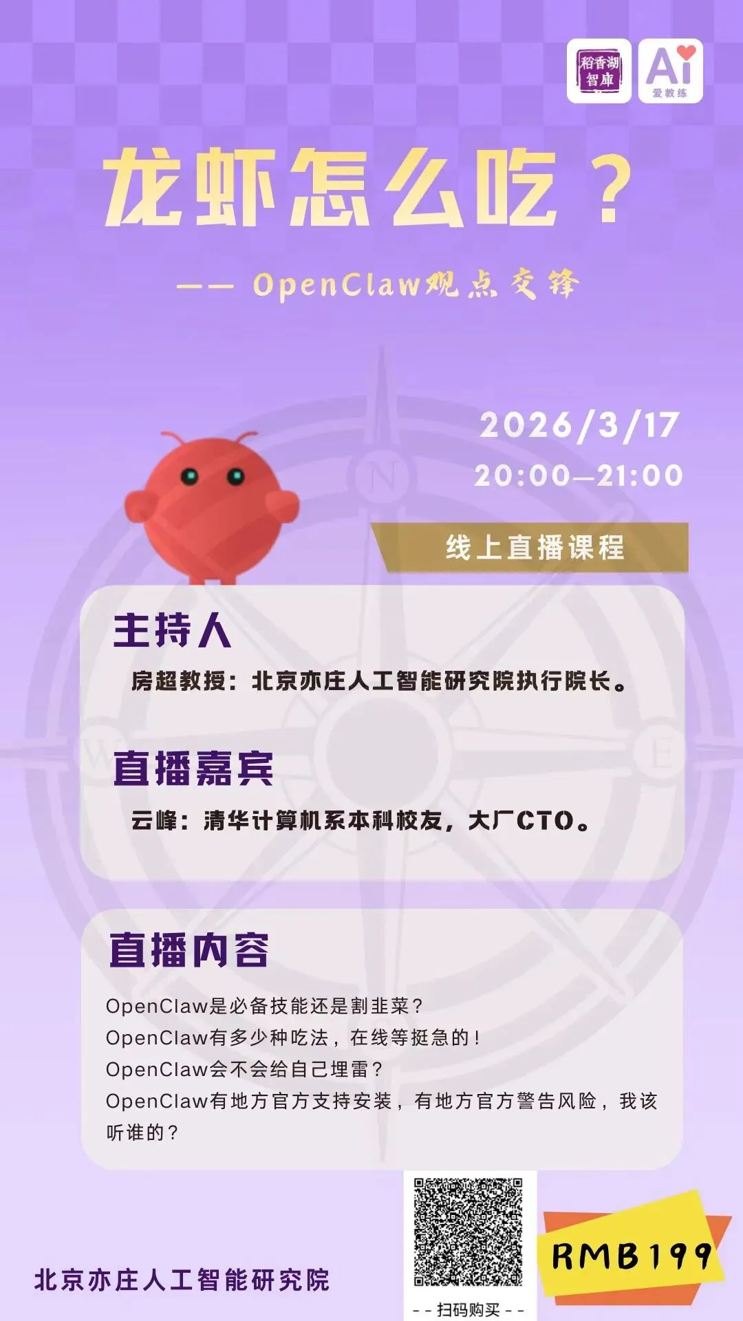 3 月 17 日(周二)晚 20:00,北京亦庄人工智能研究院重磅推出线上直播课程——「OpenClaw 观点交锋」。