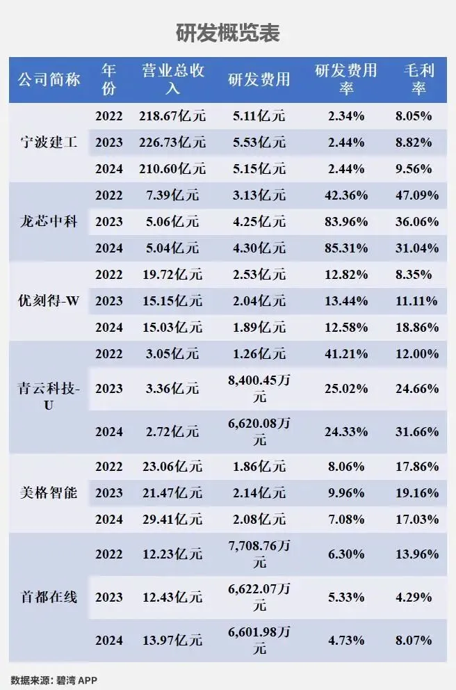 根据宁波建工(601789)、龙芯中科(688047)、优刻得-W(688158)、青云科技-U(688316)、美格智能(002881)、首都在线(300846)公开披露数据,对6家公司的研发实力信息等数据统计如下。
