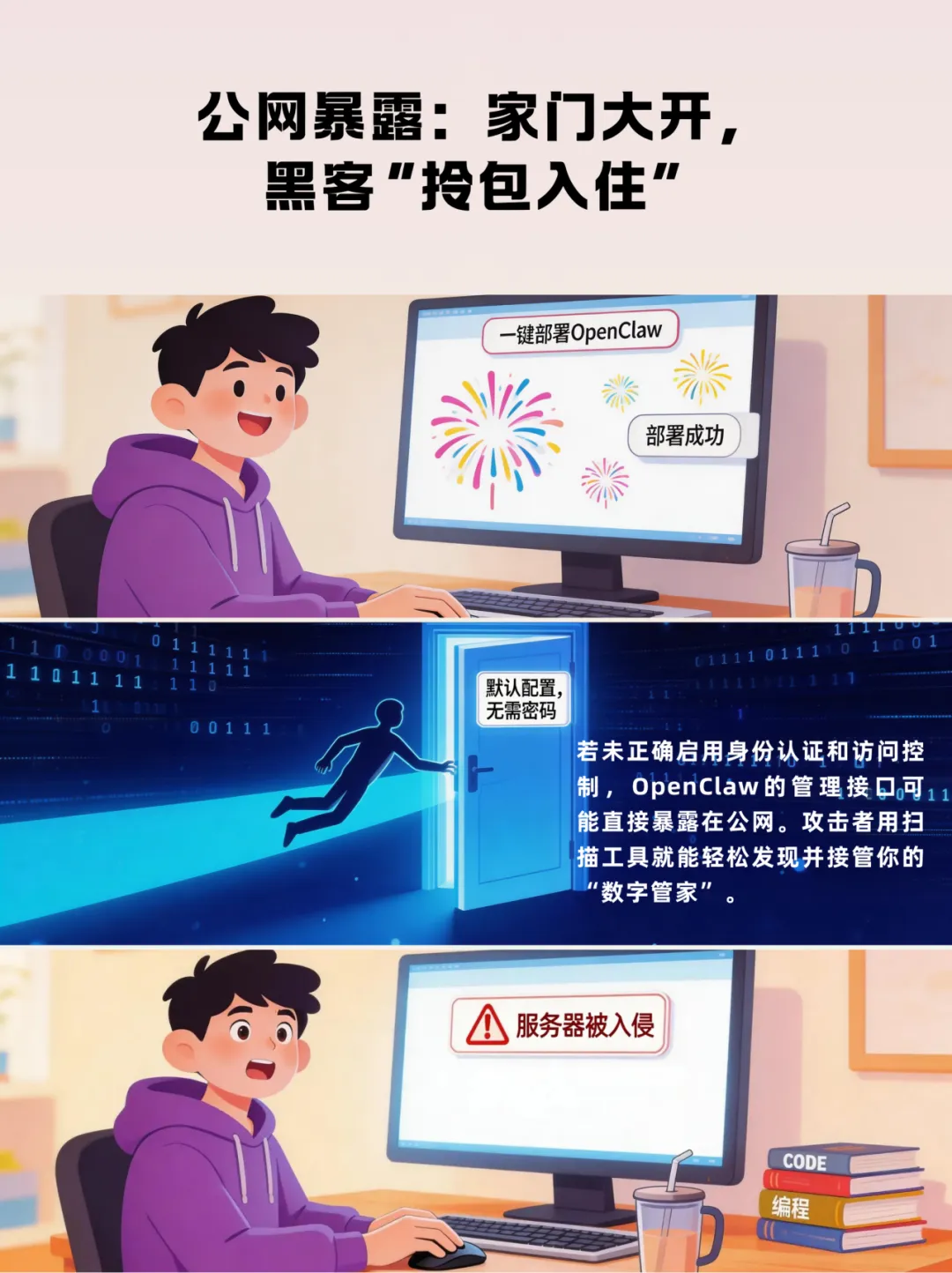 国家互联网应急中心和工信部网络安全威胁和漏洞信息共享平台先后发布风险提示,指出OpenClaw在默认或不当配置下存在六大安全隐患,极易引发网络攻击、信息泄露。