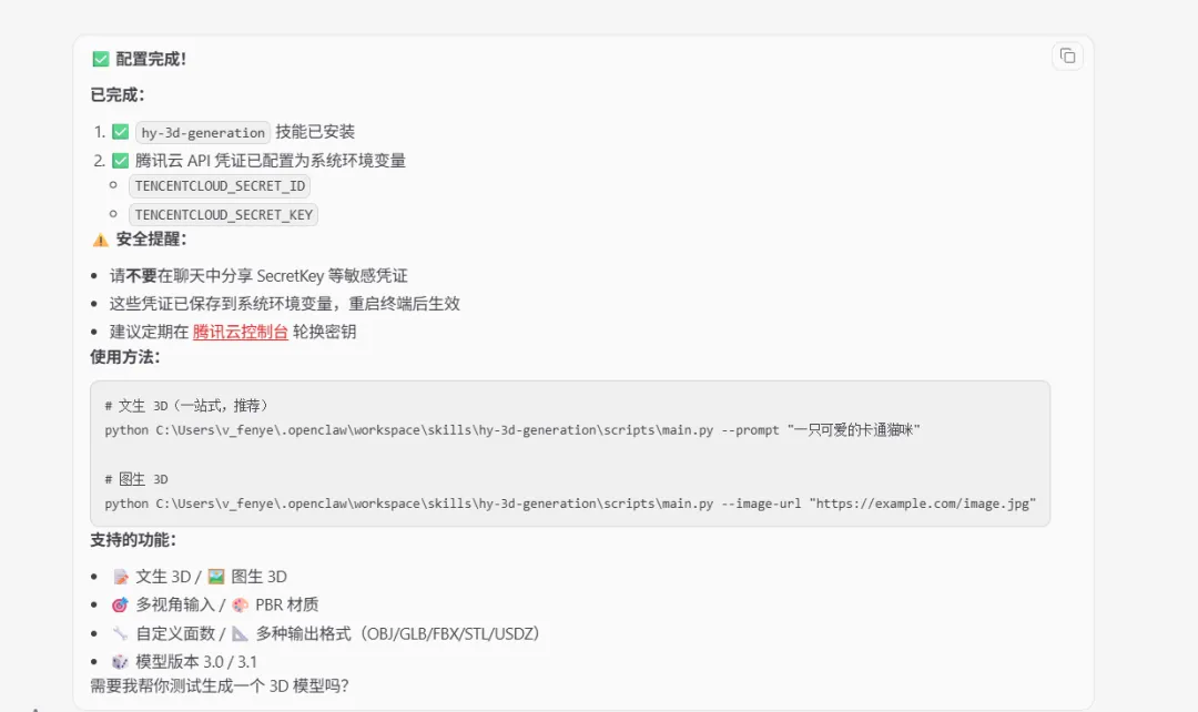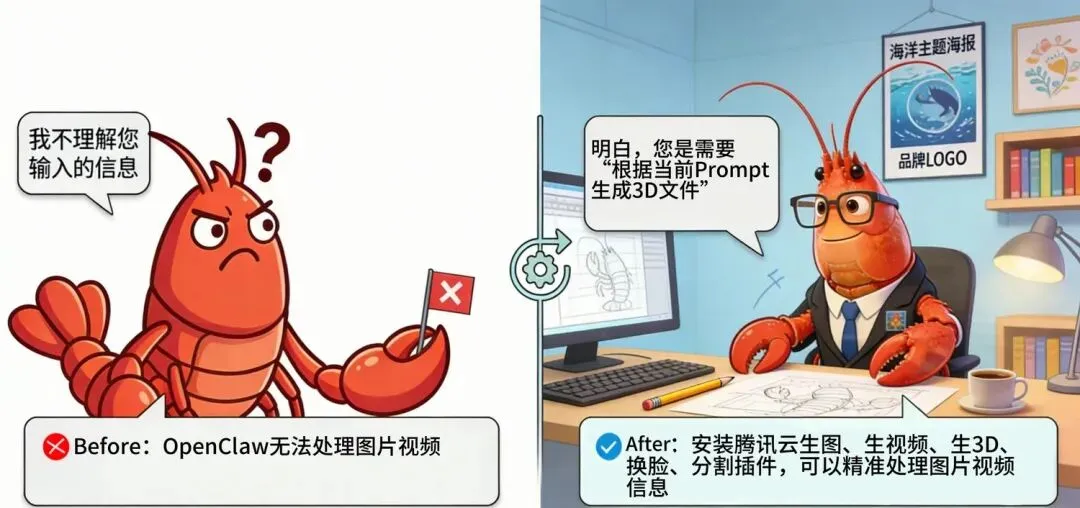 在这个系列的前几篇里,我们已经为它装上了耳朵(ASR,让它听懂人类的声音)、嘴巴(TTS,让它开口说话)、眼睛(OCR,让它看懂文字与图像)。而今天,我们要为它装上的,是一双会画画、会建模、会造世界的手。本文将手把手带你完成 OpenClaw 的安装配置,并以混元生3D、混元生图、图片人脸融合等真实场景为例,展示如何在几分钟内完成接入,让腾讯云的AIGC创作能力真正为你所用。