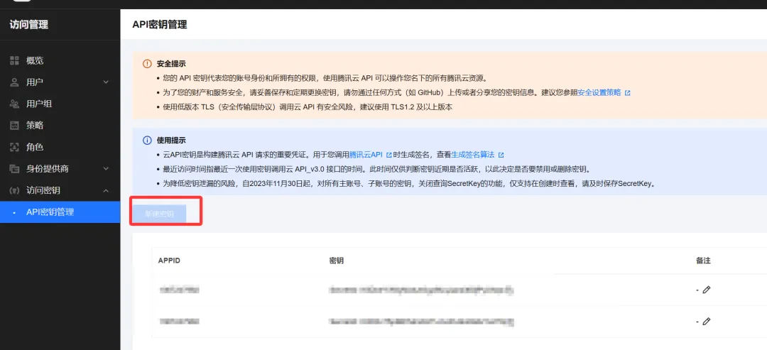 第二步:点击获取密钥信息:https://console.tencentcloud.com/cam/capi