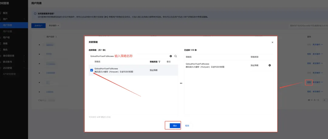 主账户登录之后点击用户列表,在对应的子账户后面选择授权,会弹出关联策略的弹窗,输入授权策略名称之后搜索,选择对应的策略点击确认。