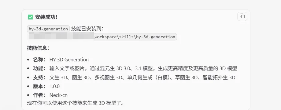 “帮我通过clawhub安装hy-3d-generation这个skill”