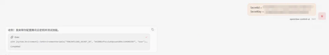 第二步:给 OpenClaw 发送配置指令(替换为实际密钥,注意防止信息泄露):