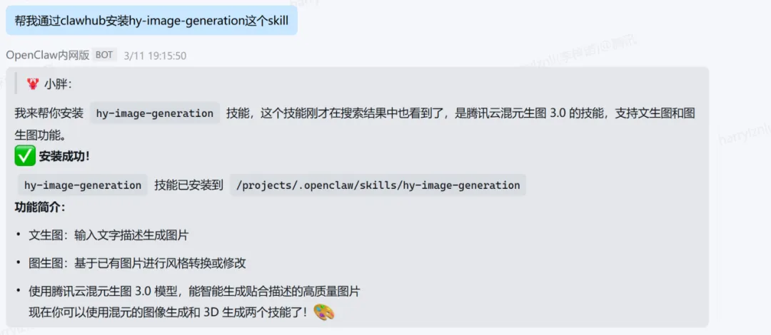 众所周知,OpenClaw 是一款面向个人的开源Agent 工助手。通过插件化的 Skill 机制,腾讯云将系列AIGC 能力,如——腾讯混元生图 3.0、腾讯混元生视频、腾讯混元生3D,以及人脸融合、人像分割等创意工具——以极低的接入成本,直接集成进你的日常工作流。无论你是需要快速生成电商商品主图的运营人员,还是希望将静态图片一键转化为动感视频的内容创作者,或是探索3D建模新范式的设计师,OpenClaw 都能让你以一句自然语言指令,驱动背后的AI 引擎,将创意秒变为可见的成果。