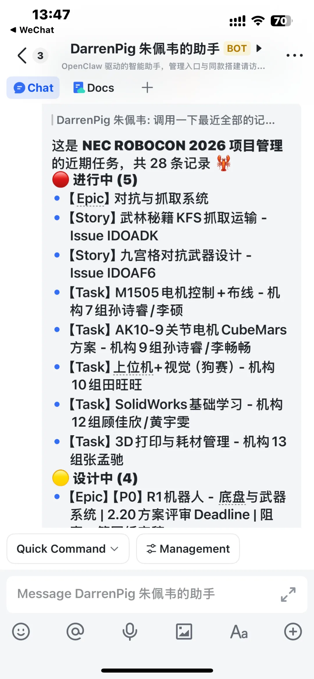 这种定位解释了为什么它看起来“很强”,却又不构成技术突破。以前工程团队需要花大量时间在流程沟通和任务协调上,现在这些工作被自动化地整理、分发、追踪。机器人执行什么动作,依然由原有控制系统决定;OpenClaw做的是把复杂的项目推进过程变得透明、可控、可追溯。它更像一个数字化 PM,而不是具身智能的大脑。