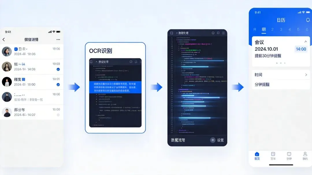 技术原理:微信截图 → OCR文字识别 → NLP信息提取 → 创建日历事件 → 同步到iPhone