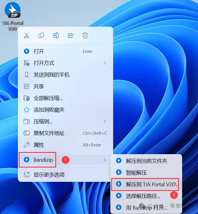 1、下载TIA Portal V20软件安装包到电脑上,右键选择【解压到TIA Portal V20\】