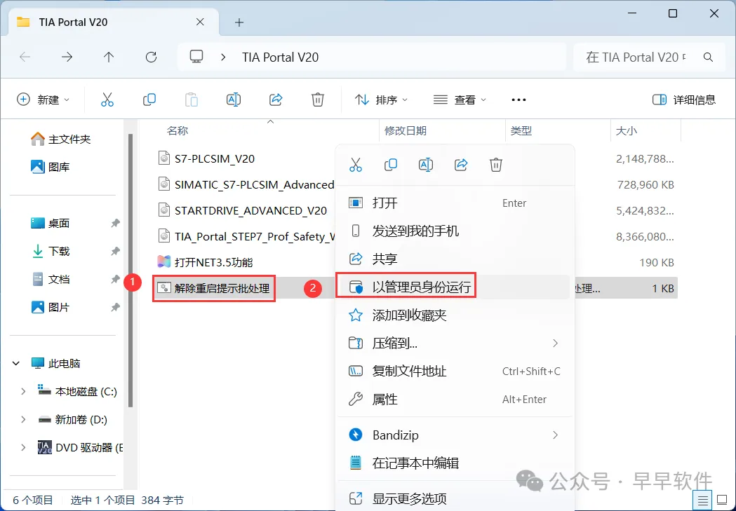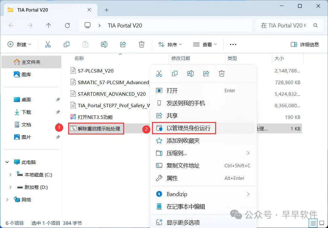28、回到TIA Portal V20文件夹,找到【解除重启提示批处理】文件,右键选择【以管理员身份运行】它