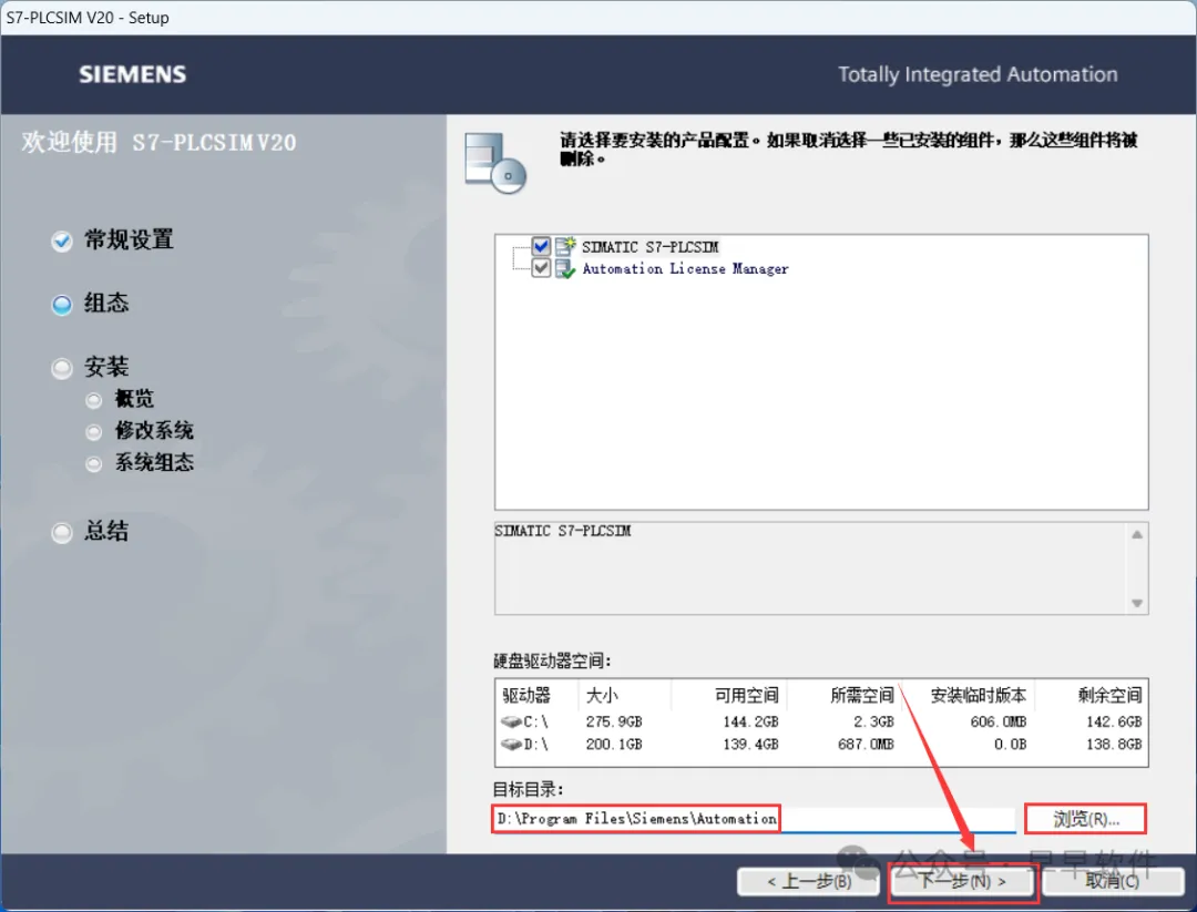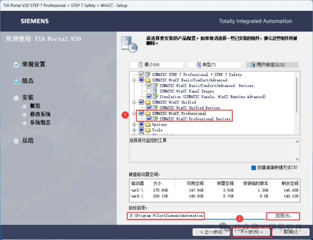10、软件默认安装在C盘,可自定义更改软件安装位置,这里小编选择安装在D盘;勾选【SIMATIC WinCC Professional】,再点击【下一步】