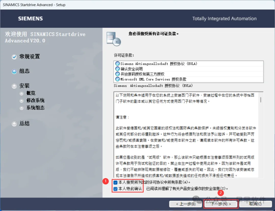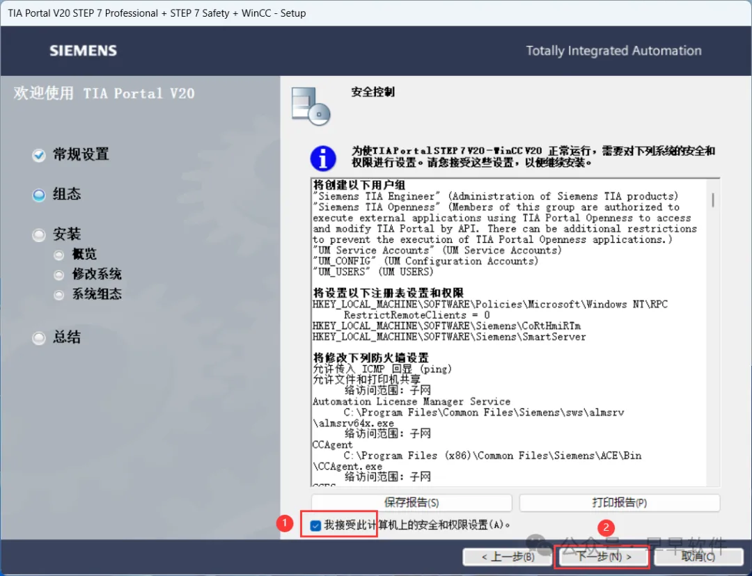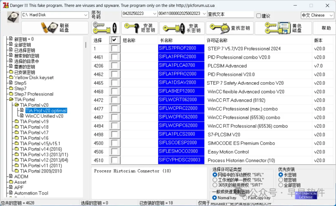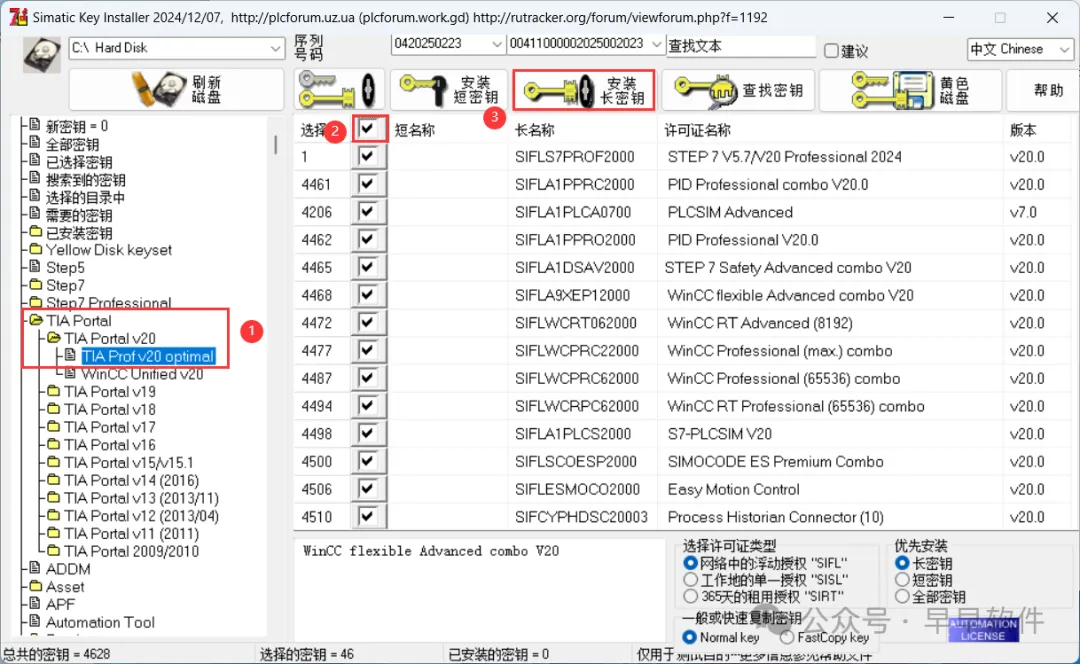 39、双击左侧【TIA Portal V20】,依次点击【TIA Portal V20 optimal】,全选【短名称】,再点击【安装长密钥】