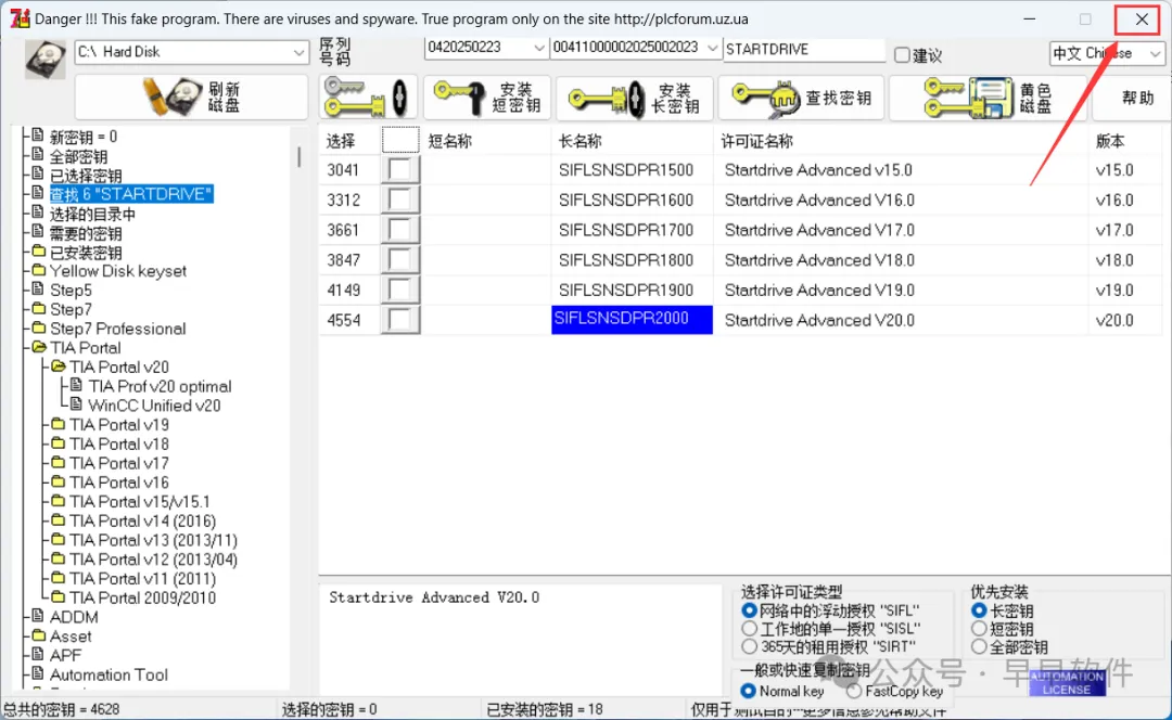 41、搜索框输入:STARTDRIVE,点击【查找密钥】,勾选【4554】短密钥, 再点击【安装长密钥】