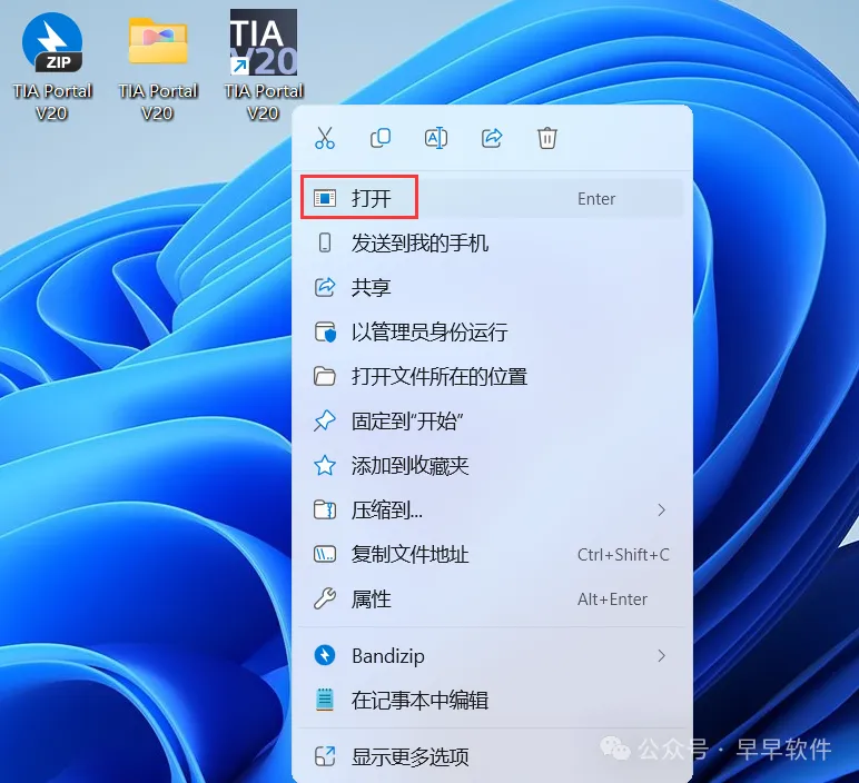 43、回到桌面,右键桌面上的【TIA Portal V20软件图标】,点击【打开】