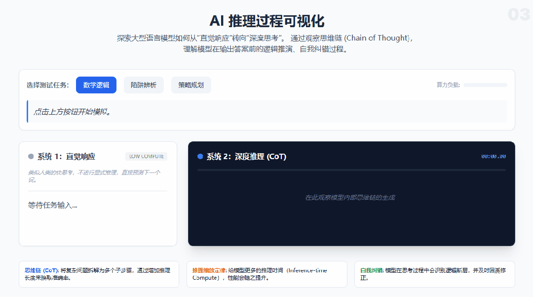 比如这里,它直接在网页中生成了一个可视化模拟器,来横向对比模型不思考和深度推理过程中发生了什么。