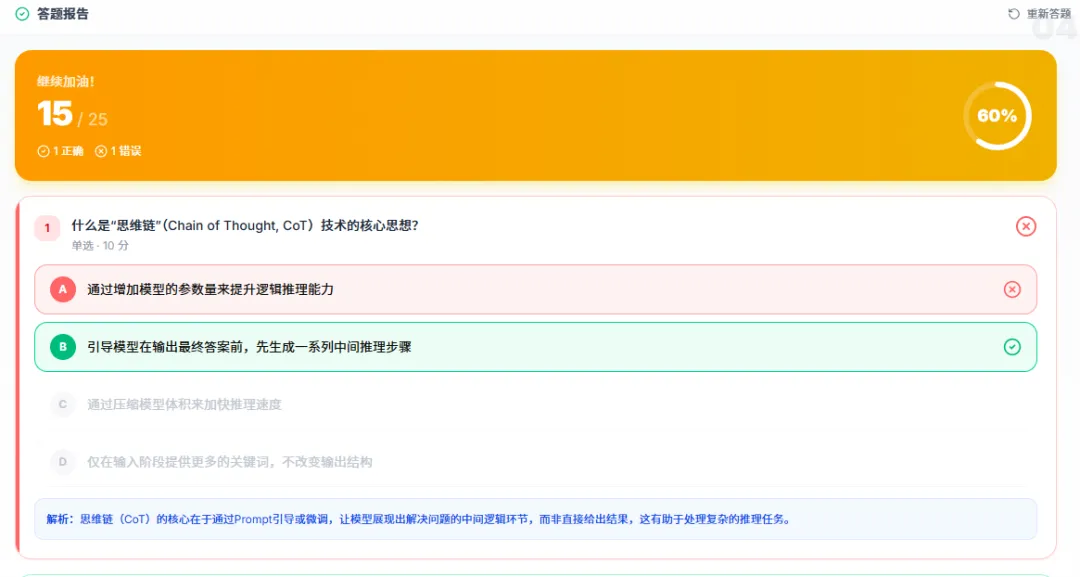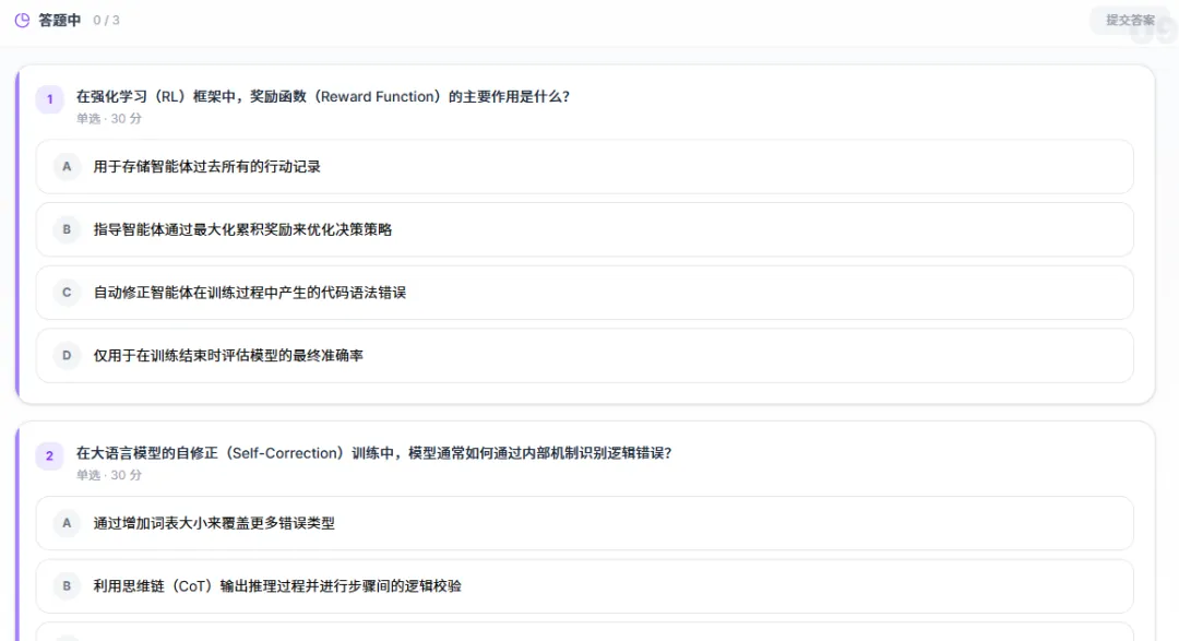 而且上课不单单只是讲课,在学习的途中,OpenMAIC 还会给我们安排一些随堂小测验,并直接由AI进行判分。