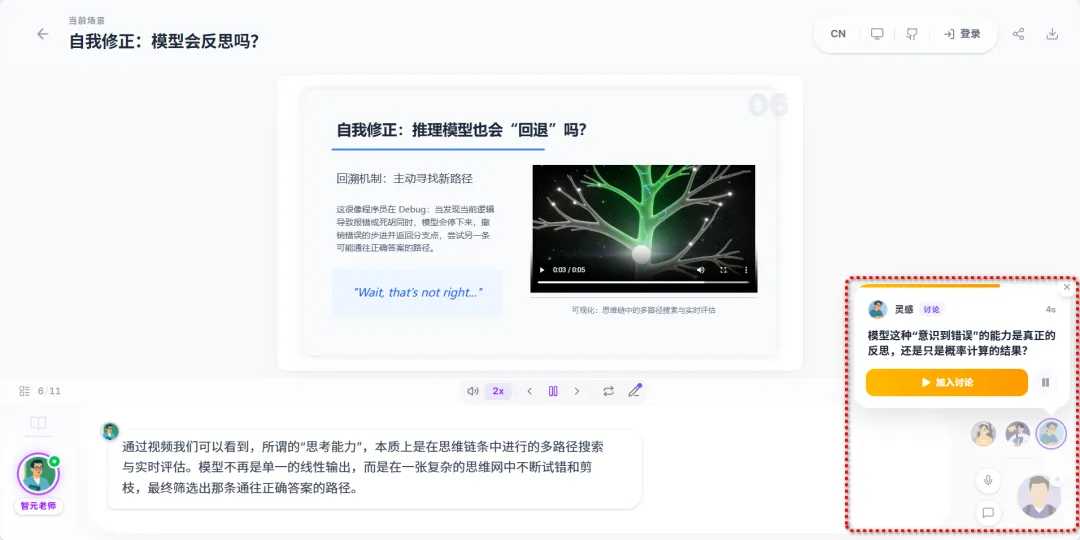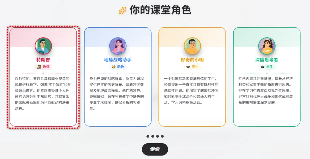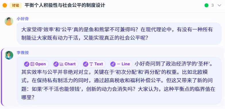 除了生动的课件,最让莫理感兴趣的来了。在课堂里绝不是只有 AI 老师在单方面念经,而是真有几个AI同学陪你一起上!