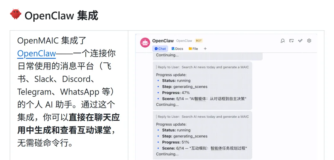 除了在线体验,也支持一键本地部署,兼容主流的大模型API。甚至OpenMAIC 还集成了 OpenClaw。