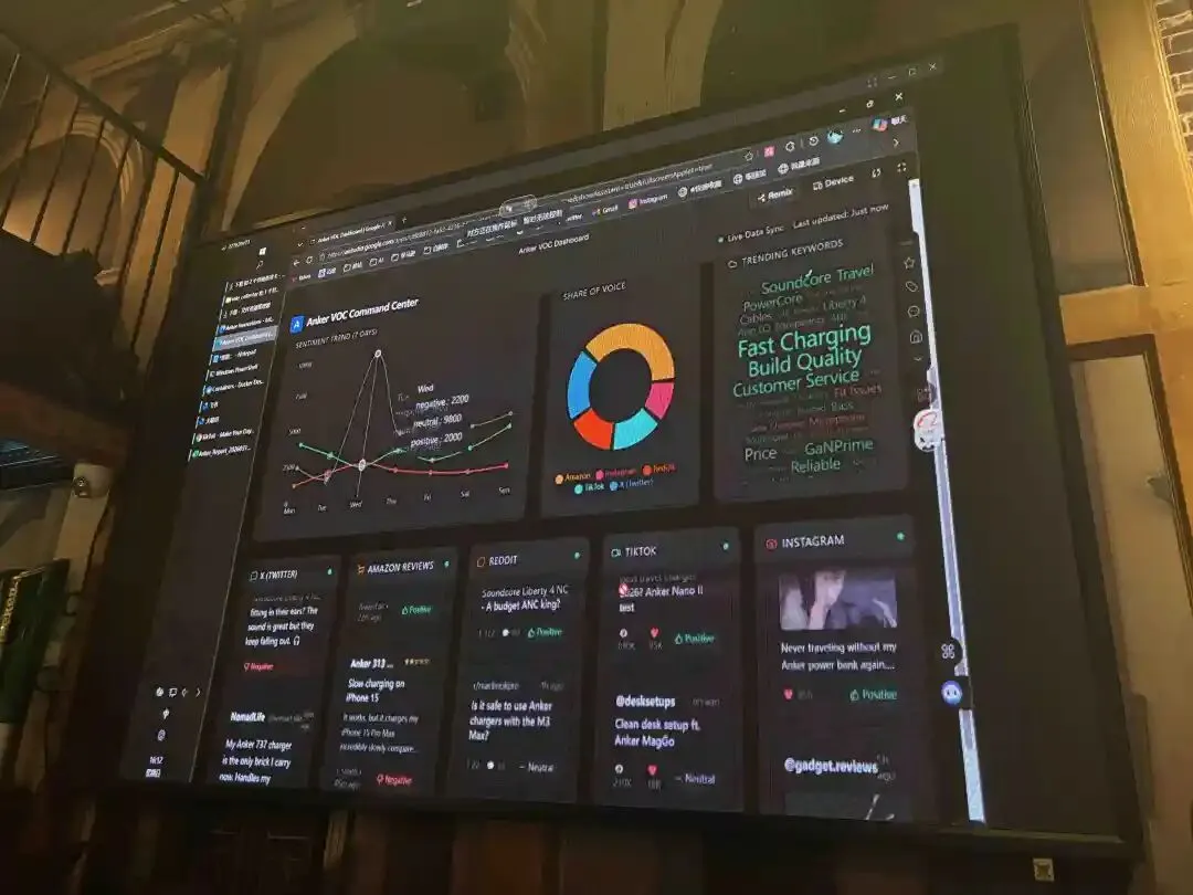 最终呈现的效果是一个完整的舆情看板,拿安克(Anker)做的案例——最上面是今日舆情洞察总结,哪些需要紧急关注、哪些是中等优先级、哪些是正面舆情。下面是品牌被提及的次数和趋势变化,正面、消极、中立的占比,各平台的分布情况,用户高频关键词的词云,以及各平台最新帖子的滚动展示。