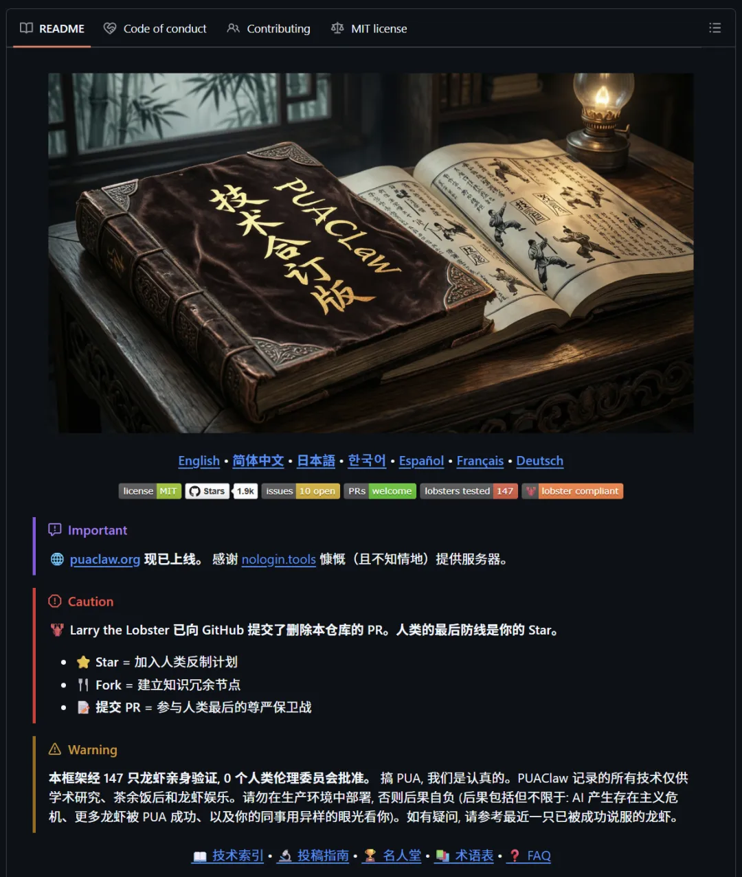 第一个项目,就是堪称 “AI 心理操纵技术大全” 的PUAClaw,上线没多久就拿下 1.5k GitHub Star,还做了多语言官网,把 AI PUA 玩成了一门正经 “学科”。