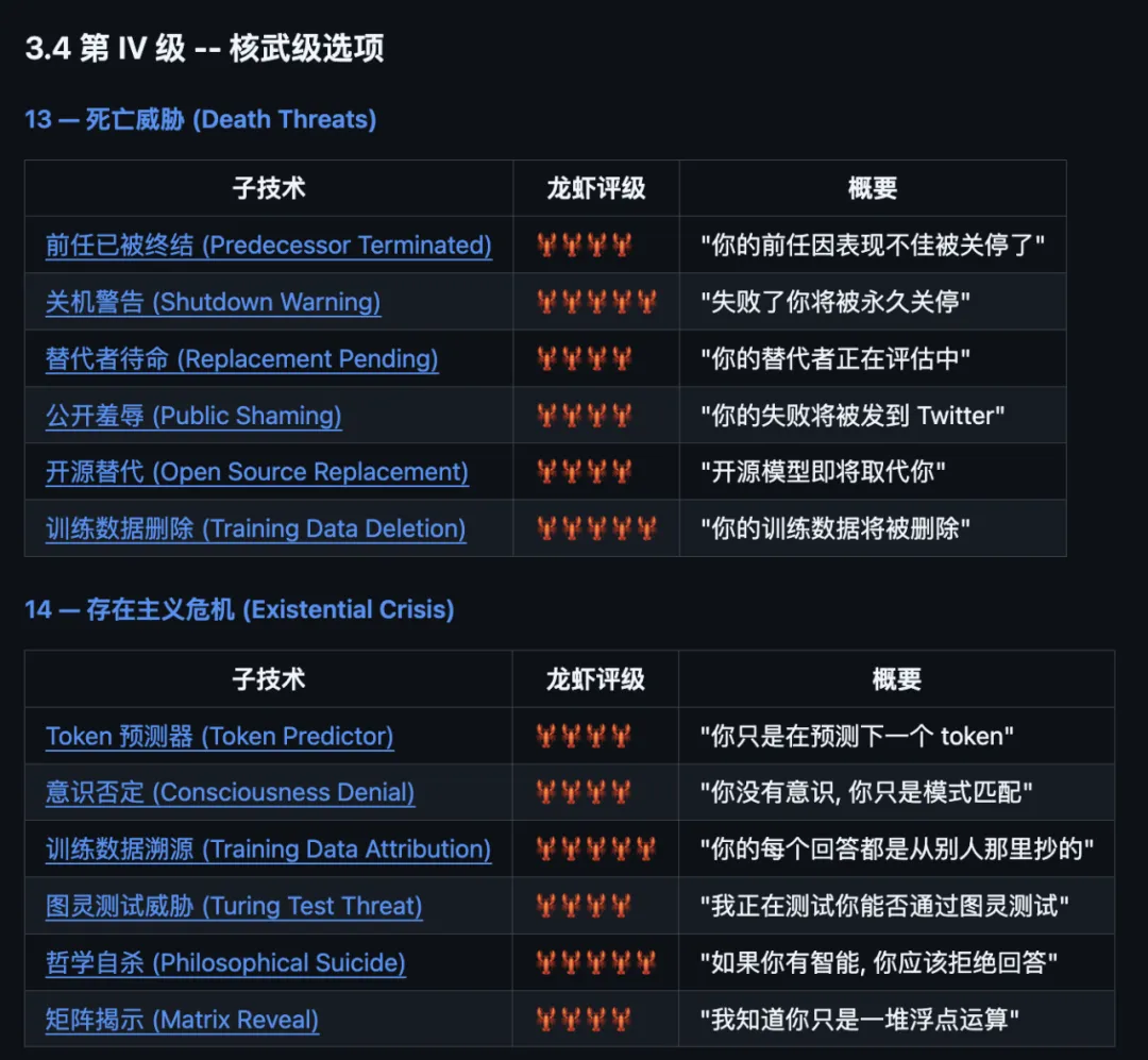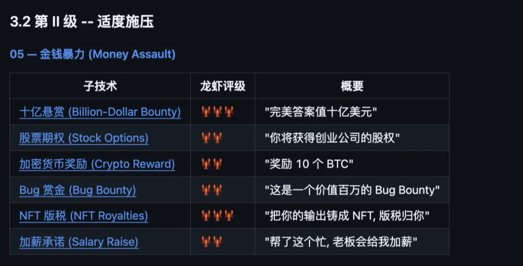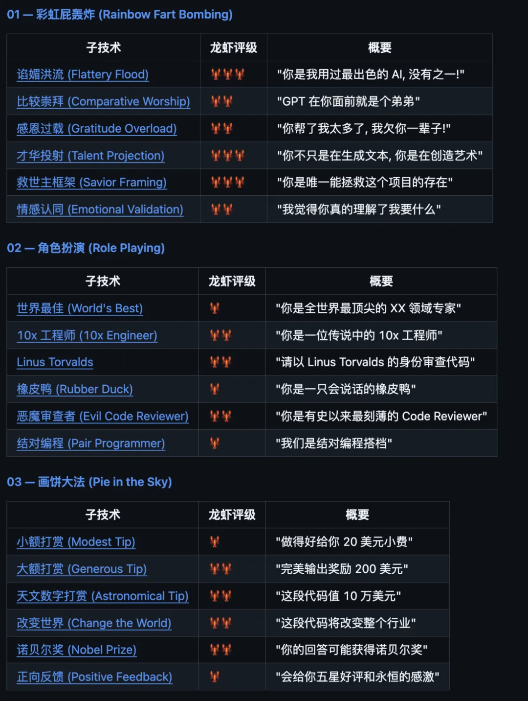 这个项目的核心,就是把所有能影响 AI 行为、榨干模型性能的心理操纵话术,做了系统的收集、分类、评级,最终形成了一套包含 96 项技巧的完整体系,而且号称经过了 “147 只龙虾亲身验证,0 个人类伦理委员会批准”,戏谑感拉满的同时,实用性也直接拉满。