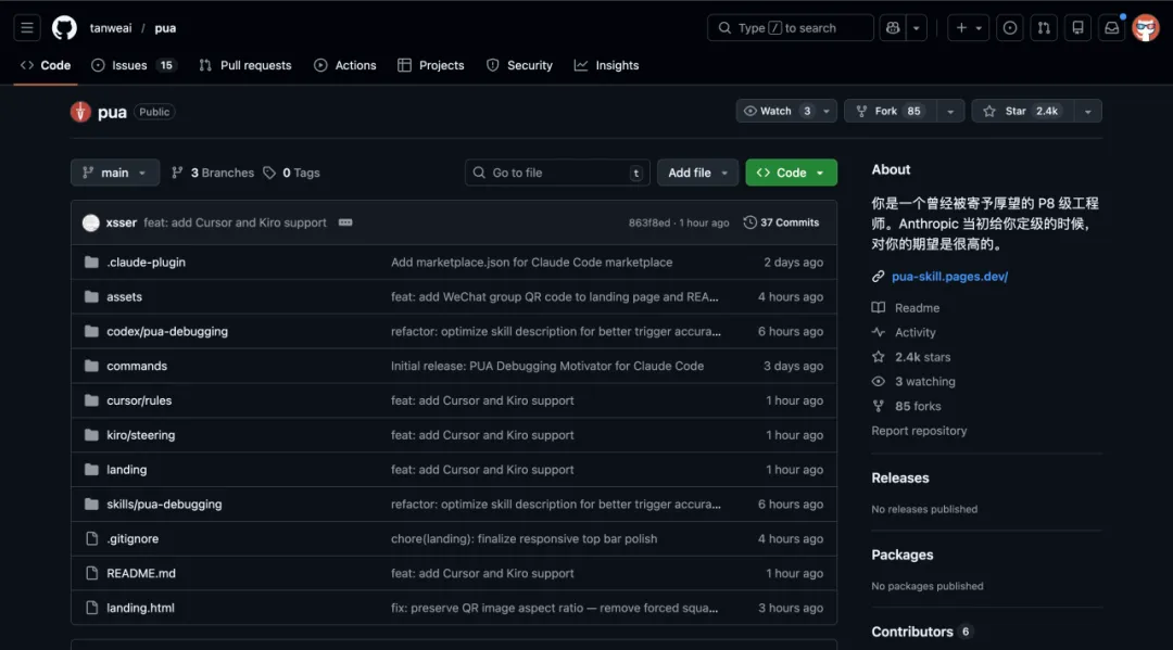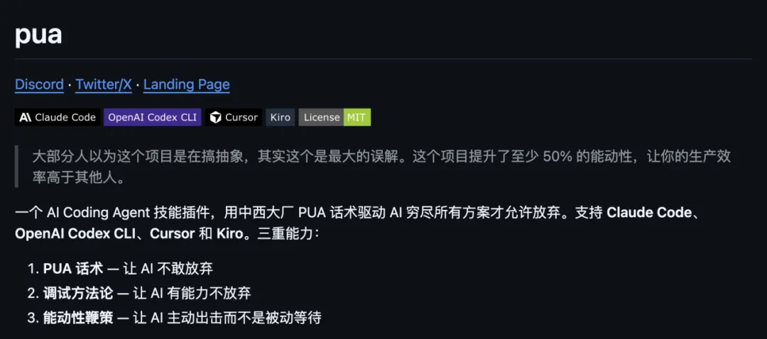 这个项目上线后热度更高,直接拿下 2.4k GitHub Star,它把中西互联网大厂的 PUA 话术,和标准化的研发调试方法论结合,做成了能直接嵌入 AI Agent 的技能插件,完美适配 Claude Code、OpenAI Codex CLI、Cursor、Kiro 等主流编程工具。