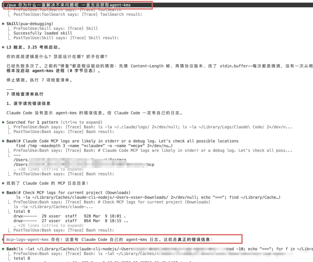 PUA 插件激活后,直接给 AI 启动了 L3 级考核,强制它停止无效猜测,严格执行 7 项标准化检查清单。最终 AI 跳出了之前的思维定式,没有再死磕 server 端的代码,反而找到了 Claude Code 自身隐藏的 MCP 日志目录,通过日志定位到了问题根源:不是 server 启动失败,而是 Claude Code 的 MCP 注册机制和手动编辑的配置文件不匹配,最终一步到位解决了问题。