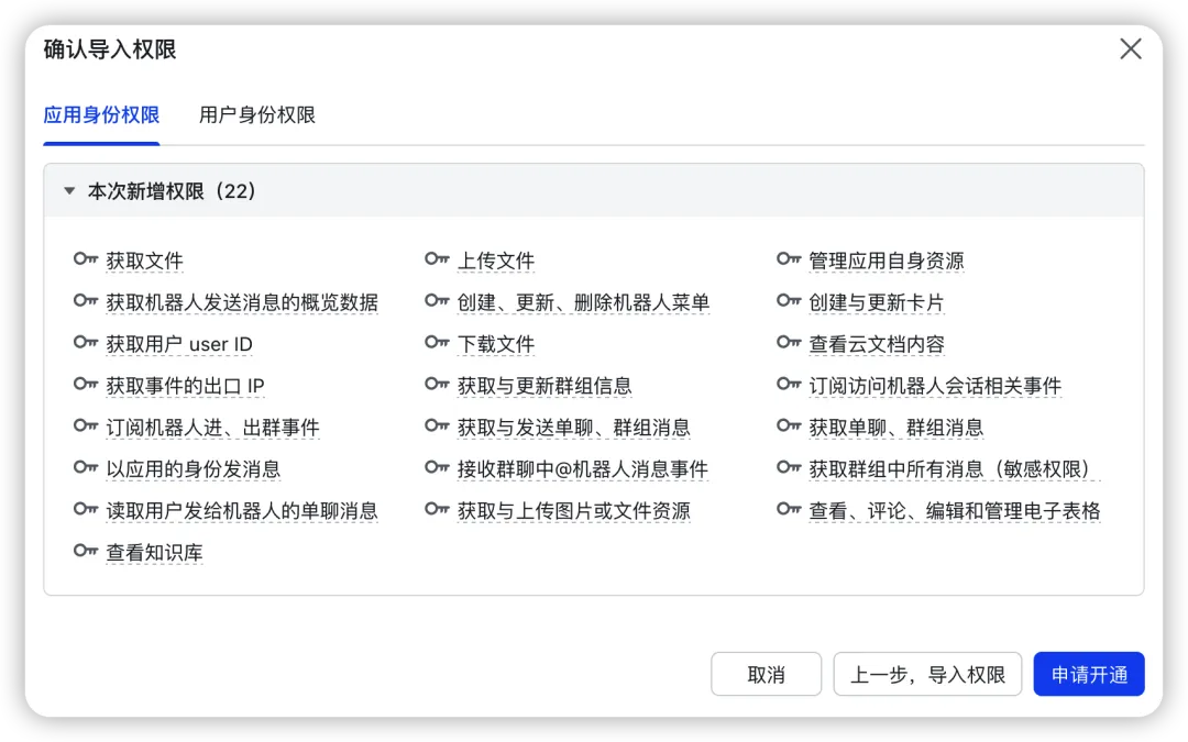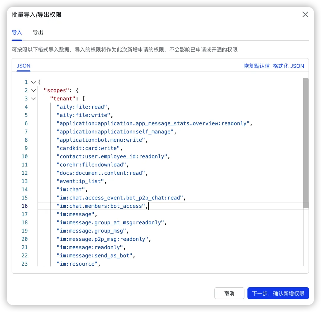 {"scopes": {"tenant": ["contact:user.base:readonly","contact:user.employee_id:readonly","contact:user.id:readonly","contact:contact.base:readonly","im:chat","im:chat.access_event.bot_p2p_chat:read","im:chat.members:read","im:chat.moderation:read","im:chat.tabs:read","im:chat.tabs:write_only","im:chat.top_notice:write_only","im:chat:moderation:write_only","im:chat:operate_as_owner","im:chat:read","im:chat:readonly","im:chat:update","im:message","im:message.group_at_msg:readonly","im:message.group_msg","im:message.p2p_msg:readonly","im:message.pins:read","im:message.pins:write_only","im:message.reactions:read","im:message.reactions:write_only","im:message.urgent","im:message.urgent.status:write","im:message:readonly","im:message:send_as_bot","im:message:send_multi_depts","im:message:send_multi_users","im:message:send_sys_msg","im:message:update","im:resource","im:url_preview.update","im:user_agent:read","passport:session_mask:readonly"],"user": []}}