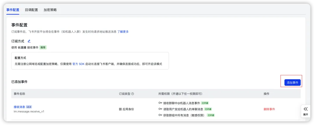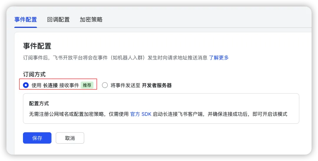 进入事件与回调 -> 点击编辑, 选择长链接, 通过WebSocket方式通信