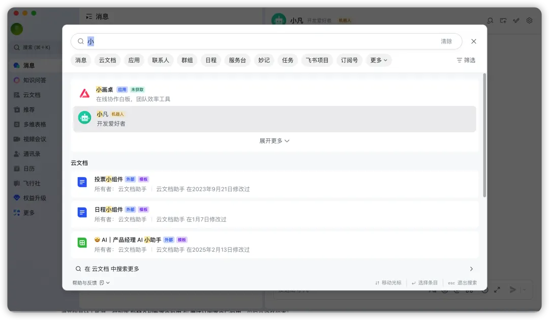 用飞书搜素你刚刚创建的机器人名称, 如图: