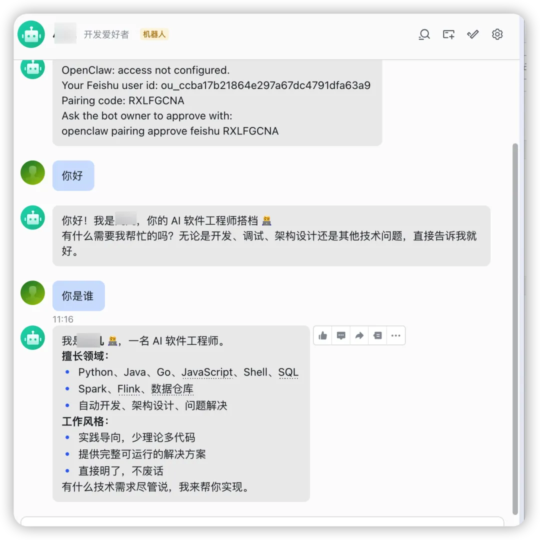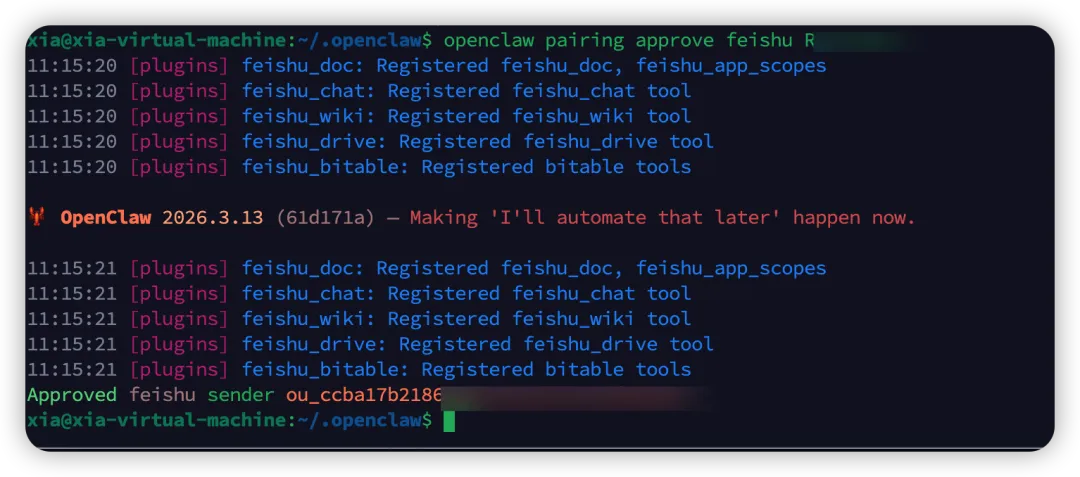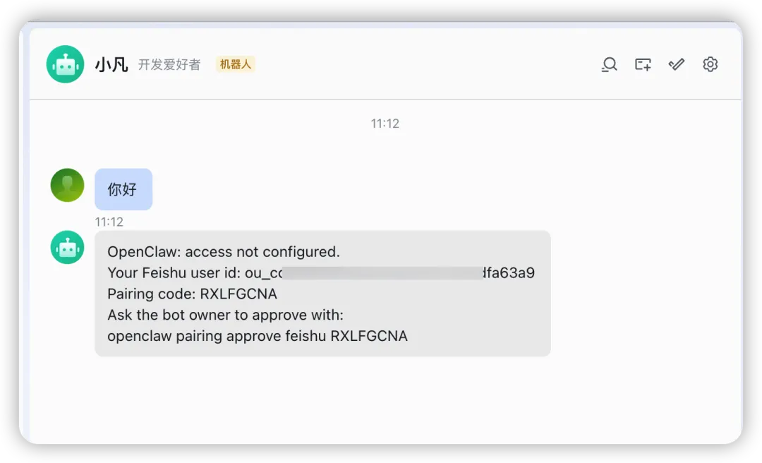 openclaw pairing approve feishu <配对码>👉 配对码来源:飞书机器人绑定流程