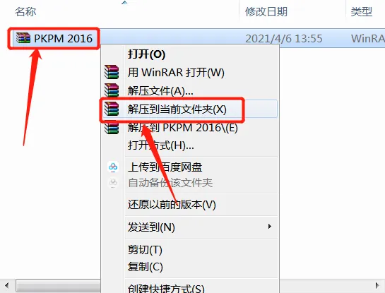 1.打开下载的PKPM 2016软件安装包,鼠标右击压缩包选择【解压到当前文件夹】。