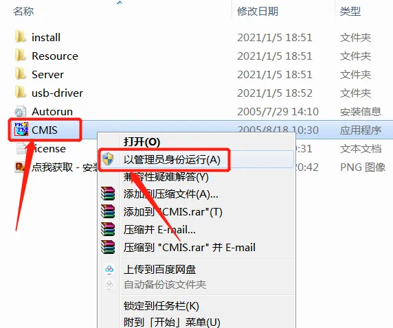 4.鼠标右击【CMIS】安装程序,选择【以管理员身份运行】。