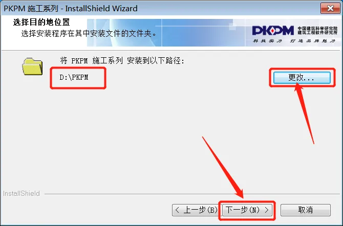 9.点击【更改】设置PKPM2016软件的安装路径,建议安装在除C盘以外的磁盘,教程中选择安装到D盘中的一个新建的文件夹,用户可自行设置,设置好安装路径后点击【下一步】。