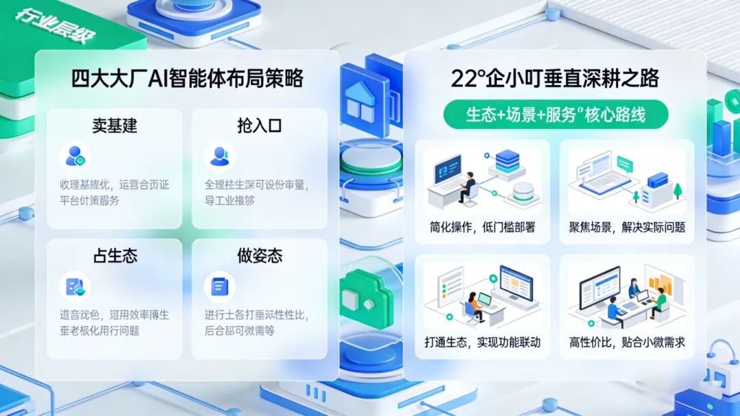 从产业链位置拆解,大厂的AI智能体布局策略大致分为四类,各有各的核心诉求与竞争优势;而22°企小叮则结合自身深耕中小微企业服务领域的核心定位,走出了一条“生态+场景+服务”的差异化垂直路线,精准切中中小微企业的AI转型痛点。