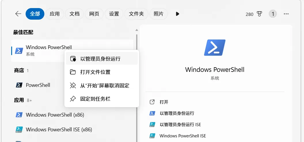 右键「Windows PowerShell」→ 选择「以管理员身份运行」(关键!普通模式会安装失败)