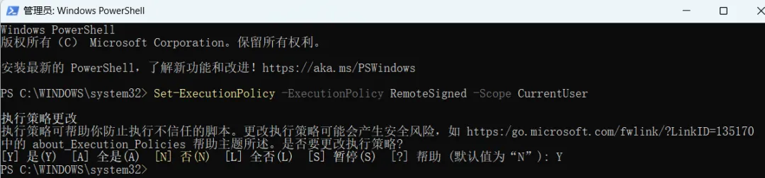 当提示「是否要更改执行策略」时,输入 Y并按回车确认。