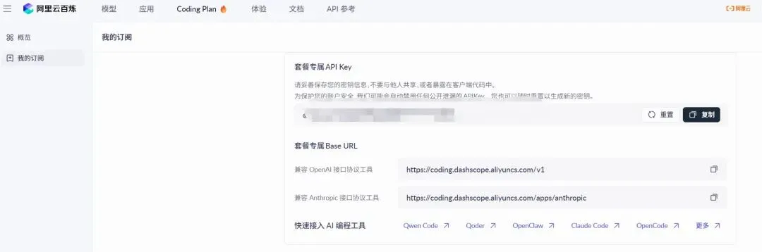 在阿里云百炼的Coding Plan中,点击创建专属 API KEY。
