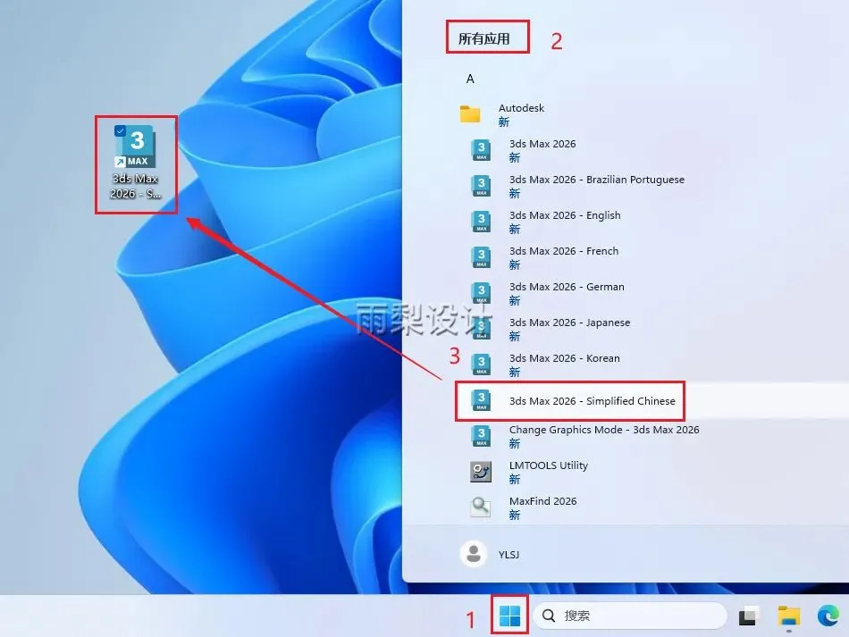 15.在【开始】>【所有应用】>【3ds Max 2026 - Simplified Chinese】拖到桌面