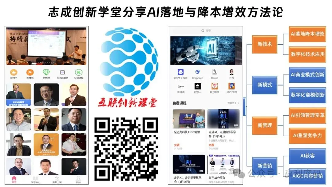 面对全球经济衰退、经济环境恶化与AI新技术革命等挑战,如何提升员工数字技能,利用AI实现降本增效?如何建立逆境中增长的创新管理模式?如何引入AI、RPA等数字技术推动企业成功转型?如何利用AI、物联网等新数字技术,进行商业模式创新?志成互联专注民企服务,为企业提供创新的咨询与培训,帮助民企穿越周期,赢得未来!