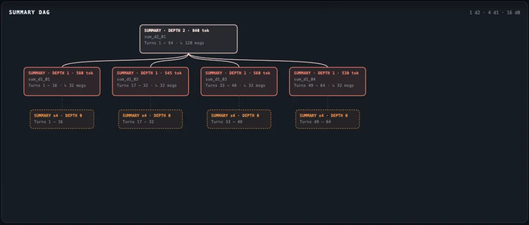 消息 1-500 → 叶摘要 A消息 501-1000 → 叶摘要 B消息 1001-1500 → 叶摘要 C叶摘要 A + B + C → 高层摘要 XAI 平时带着高层摘要 X 对话,上下文很短。但如果你问"那天讨论的数据库选型",它可以: