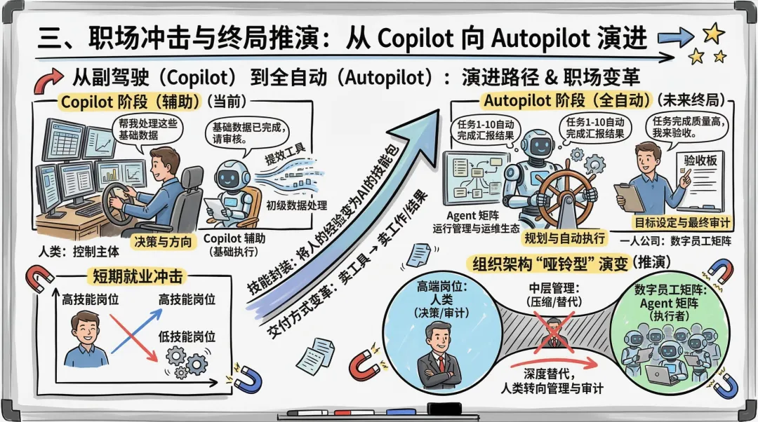 基础执行岗将被数字员工大量替代。未来的公司结构极有可能向两端集中——一端是提出需求、把控方向的高端决策者,另一端是执行任务的AI Agent,中间管理层的生存空间将受到极大挤压。