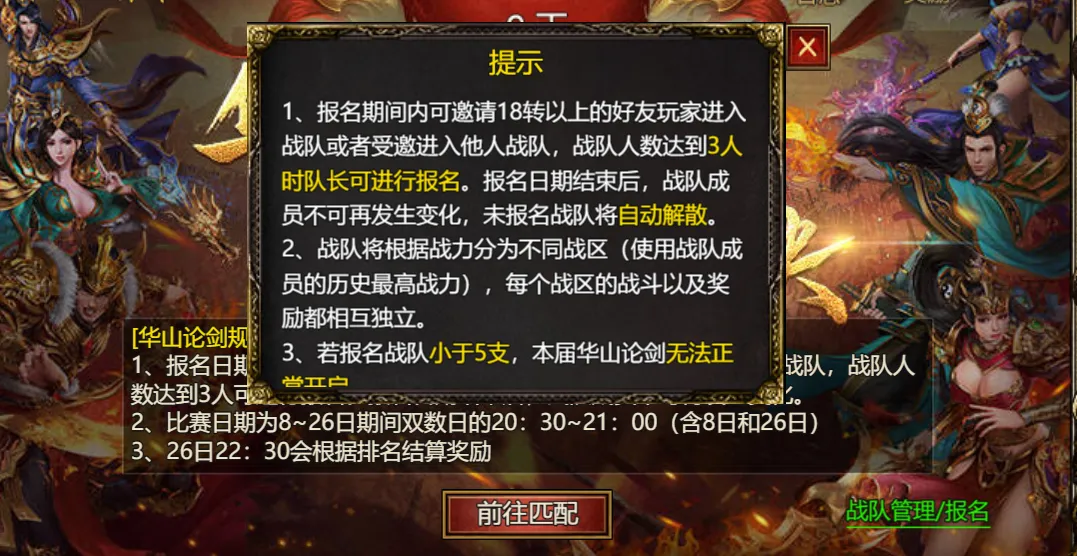 报名日期结束后,战队成员不可再发生变化,未报名战队将自动解散。比赛日期为8-26日期间,双数日的20:30-21:00,战队将根据战力分为不同战区,相当于10天,26日22:30会根据排名结算奖励。